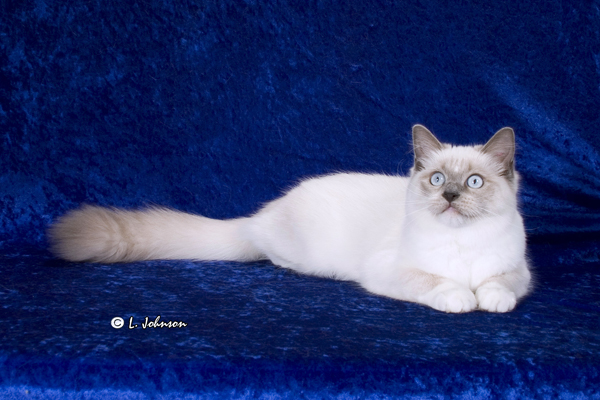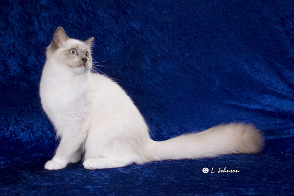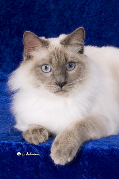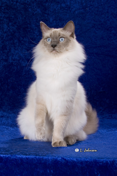 PHOTOS ABOVE AND RIGHT: CHAMPION LIONSROYALE CHEYENNE IS A SEAL LYNX COLOR POINT (CHOC. CARRIER) FROM ONTARIO, CANADA. SHE IS A WONDERFUL GIRL WITH A GREAT PERSONALITY AND WILL RETURN TO THE SHOW HALLS FOR THE 2009-2010 SHOW SEASON TO EARN HER CHAMPIONSHIP TITLES IN CFA AND TICA. THANK YOU BLOSSOM FOR TRUSTING ME WITH THIS WONDERFUL GIRL - WE LOVE HER DEARLY. She is now retired and living with her furry son not too far from me in Texas. (RETIRED)