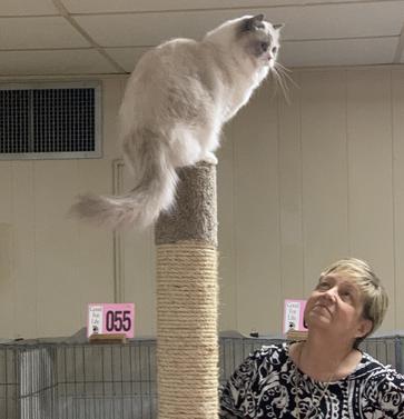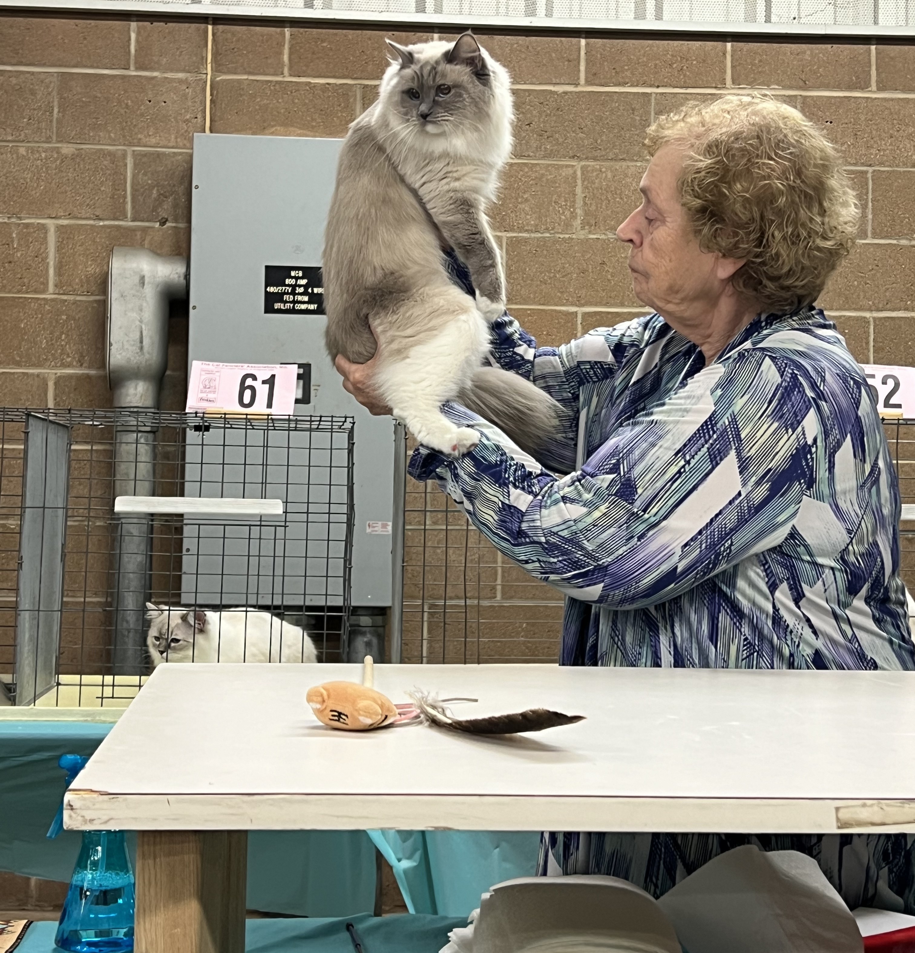 PHOTO ABOVE: CFA CHAMPION CAJUNDOLL BELLA BLUE EYES EARNING HER CHAMPION TITLE at the Stillwater, Oklahoma show in July 2024. She is the daughter of TICA Regional Winner Quadruple Grand Champion Calirags Sitting Bull aka CFA Regional Winner, Grand Champion Calirags Sitting Bull of CajunDoll and her mother is CFA champion Anarchy of CajunDoll, who came all the way from the country of Greece. Bella Blue Eyes is a beautiful blue point mitted female with deep blue eye color.