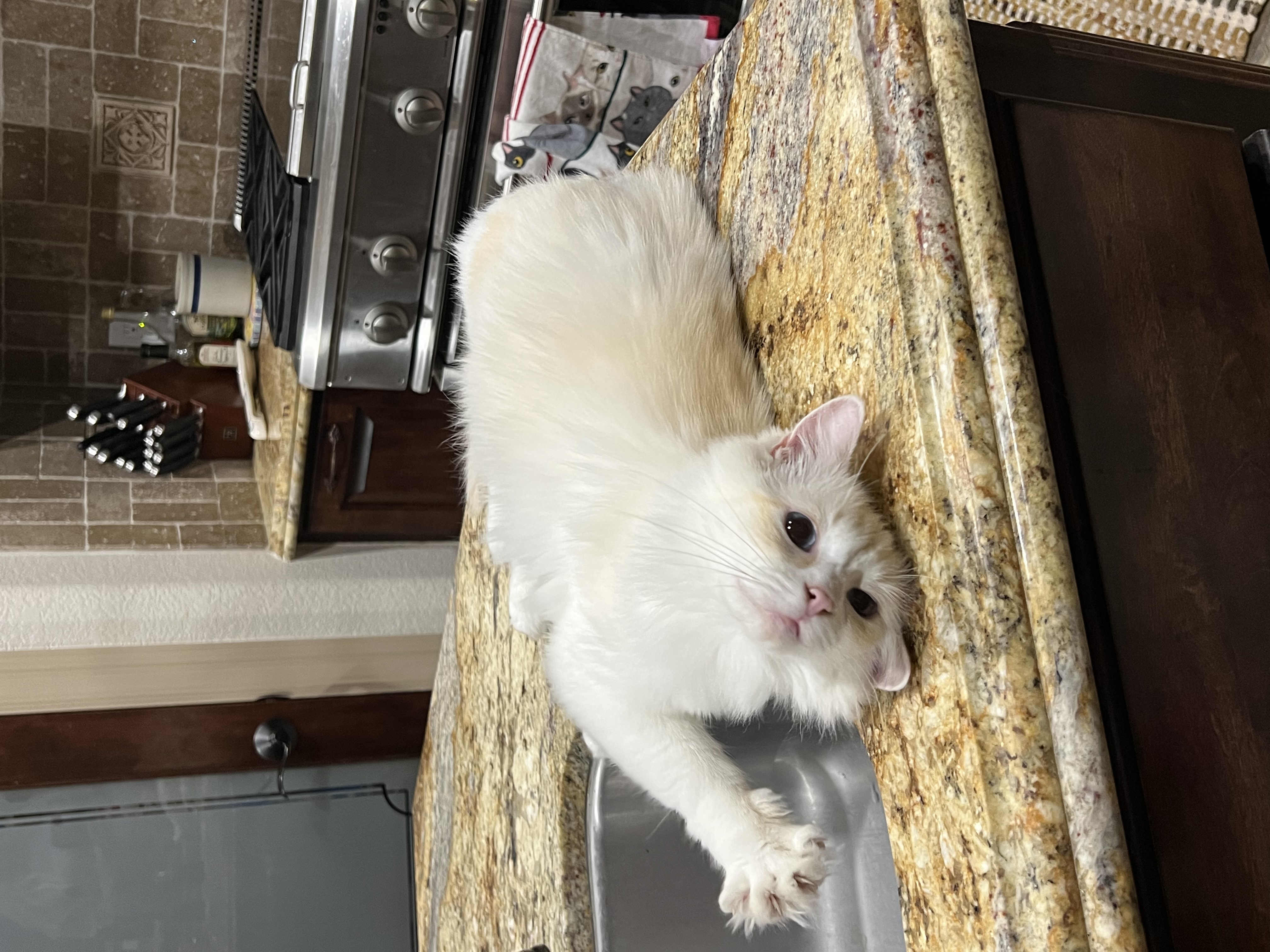 PHOTO ABOVE: MEET CFA CHAMPION CAJUNDOLL MADAME ROUGE, WHO IS NOT SUPPOSED TO BE ON MY KITCHEN COUNTERTOP POSING. SHE IS AN ABSOLUTELY BEAUTIFUL RED LYNX POINT BICOLOR WITH VERY INTENSE DEEP BLUE EYES. THIS FULL-FIGURED FEMALE IS EQUAL OPPORTUNITY WITH ALL HUMANS WISHING TO MASSAGE HER OR GIVE HER A WARM LAP TO LAY ON. (RETIRED 2025)