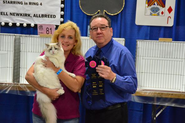 PHOTO ABOVE: THIS WAS A VERY HAPPY DAY - CAN YOU IMAGINE DRIVING FROM WESTLAKE, LOUISIANA TO SOMMERSET, NEW JERSEY? WELL, MY 16 YEAR OLD DAUGHTER, CHRISTIE AND I MADE THE LONG JOURNEY WITH THE RAGDOLLS TO ATTEND THE 9TH INTERNATIONAL RAGDOLL CONGRESS, WHICH WAS A HUGE CFA SHOW. LEAVING WESTLAKE, I KNEW I HAD TO MAKE THIS INCREDIBLE TRIP AS MY CATS WOULD DO WELL IN THIS HIGHLY COMPETITVE SHOW. DRIVING THROUGH THE DAY AND THE NIGHT, IT WAS EXTREMELY TIRING, BUT WE MADE IT FOUR HOURS BEFORE THE SHOW STARTED. SOMEHOW, I FOUND STRENGTH TO MAKE IT ALL DAY SHOWING SATURDAY WITH THE HELP OF MY DAUGHTER AND A FEW FRIENDS. I DID SLEEP FOR MANY HOURS SATURDAY NIGHT WAKING UP AS A NEW HUMAN ON SUNDAY. BY THE END OF THE SHOW ON SUNDAY AFTERNOON, I COULD HAVE DONE A BACK FLIP, BUT DECIDED I DID NOT WANT TO GO THE HOSPITAL. THE ABOVE PHOTO IS ME, ANNE PAUL HOLDING MY HOME BRED CAJUN RAGDOLL COMANCHE WARRIOR AND STANDING NEXT TO ME IS CFA JUDGE DARRYL NEWKIRK. WITH THE FINAL GIVEN IN THIS CHAMPIONSHIP RING, I KNEW THAT WE WERE PROBABLY LEAVING NEW JERSEY WITH A NEW GRAND CHAMPION AND BEST CHAMPION OF CONGRESS. JUST AFTER THIS INCREDIBLE FINAL, THE RAGDOLLS WENT TO CFA JUDGE PAM BASSETT'S RING, AND YES, COMANCHE WAS AWARDED BEST CHAMPION - MY HEART WAS IN MY STOMACH, BECAUSE, I NEEDED 11 POINTS TO GRAND - CAN YOU EVEN IMAGINE? TO MAKE MATTERS MORE INTENSE, THE FINAL WAS CALLED IN PAM BASSETT'S RING SHORTLY THERE AFTER, AND YES, NUMBER 129 WAS CALLED BACK, BUT THE RAGDOLLS HAD BEEN CALLED TO THE SPECIALTY RING. I IMMEDIATELY RAN TO THE RING CLERK IN PAM BASSETT'S RING AND TOLD HER - I WILL BE HERE AS SOON AS POSSIBLE, BUT THE RAGDOLLS ARE BEING JUDGED IN ANOTHER RING. ALMOST THIRTY MINUTES PASSED AND THE RAGDOLLS WERE FINALLY RELEASED FROM JUDGING, I COULD BRING COMANCHE TO THE FINAL IN PAM BASSETT'S RING. HE WAS AWARDED THIRD BEST LONG HAIR - IT WAS THE POINTS I NEEDED FOR HIM AND MORE - HE WAS NOW A GRAND CHAMPION AND THE ENTIRE SHOW HALL HEARD ME AS I PROCLAIMED THE NEW CFA GRAND CHAMPION. MY HANDSOME COMANCHE AT 11 MONTHS OLD IN THIS PICTURE LET THE WORLD KNOW THAT THE DEEP SOUTH HAS SOME HOME BRED RAGDOLLS THAT ARE VERY LOVED AND BRED TO THE RAGDOLL STANDARD. COMANCHE HAS HAD AN AWESOME SHOW SEASON IN CFA AND WAS AWARDED A REGIONAL WIN FOR 2014-2015. AS THE CFA ALMANAC SHOWS, HE WAS THE NUMBER ONE RAGDOLL IN CHAMPIONSHIP FOR THE 2014-2015 IN THE UNITED STATES OF AMERICA. HE IS ALSO A REGIONAL WINNER IN TICA AND A SUPREME GRAND CHAMPION.