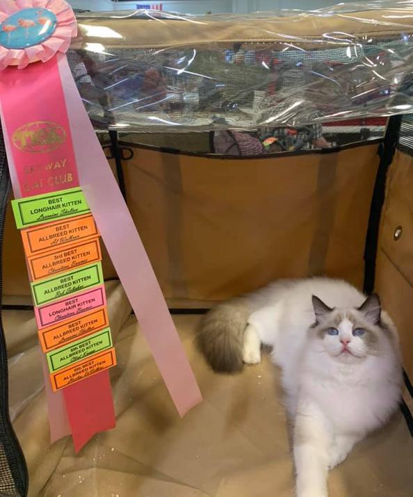 PHOTO ABOVE: TICA REGIONAL WINNER QUADRUPLE GRAND CHAMPION CAJUN RAGDOLLS MYSTIC KREWE AKA CFA GRAND CHAMPION CAJUNDOLL MYSTIC KREWE DAUGHTER OF CHIEF GERONIMO AND MARDI GRAS BORN DECEMBER 31, 2017. THIS GIRL HAS THE MOST INCREDIBLE PERSONALITY, VERY SMART, AND LOVES HER HUMANS.