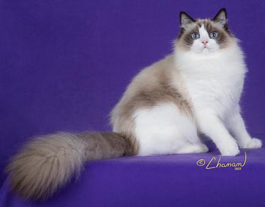 PHOTO ABOVE: CFA & TICA CHAMPION CAJUNDOLL SACRED MOON DANCER AKA "BAD BAD". SHE IS THE DAUGHTER OF RW, CH CAJUNDOLL CHEYENNE MANKILLER AKA "BAD NOT NICE" AND INTERNATIONAL WINNER, BREED WINNER, SUPREME GRAND CHAMPION ZUCCHERO. HER NICKNAME IS DUE TO BEHAVIOR WITH TEARING UP TOILET PAPER AND PAPER TOWELS, AND NO PRIVACY IN THE BATHROOM TO ANY HUMAN. SHE WAS BORN IN AUGUST 2024 AND IS CURRENTLY SHOWING IN TICA & CFA DOING VERY WELL. I WILL PROBABLY LET HER MEET PERFECT STORM FOR A DATE IN SUMMER 2026. IT SIMPLY DEPENDS ON HER MATURITY AND CAREER. RIGHT NOW, SHE IS FOCUSED ON BECOMING A CFA GRAND CHAMPION AND HOPEFULLY A REGIONAL WIN QUAD OR SUPREME TITLE IN TICA.